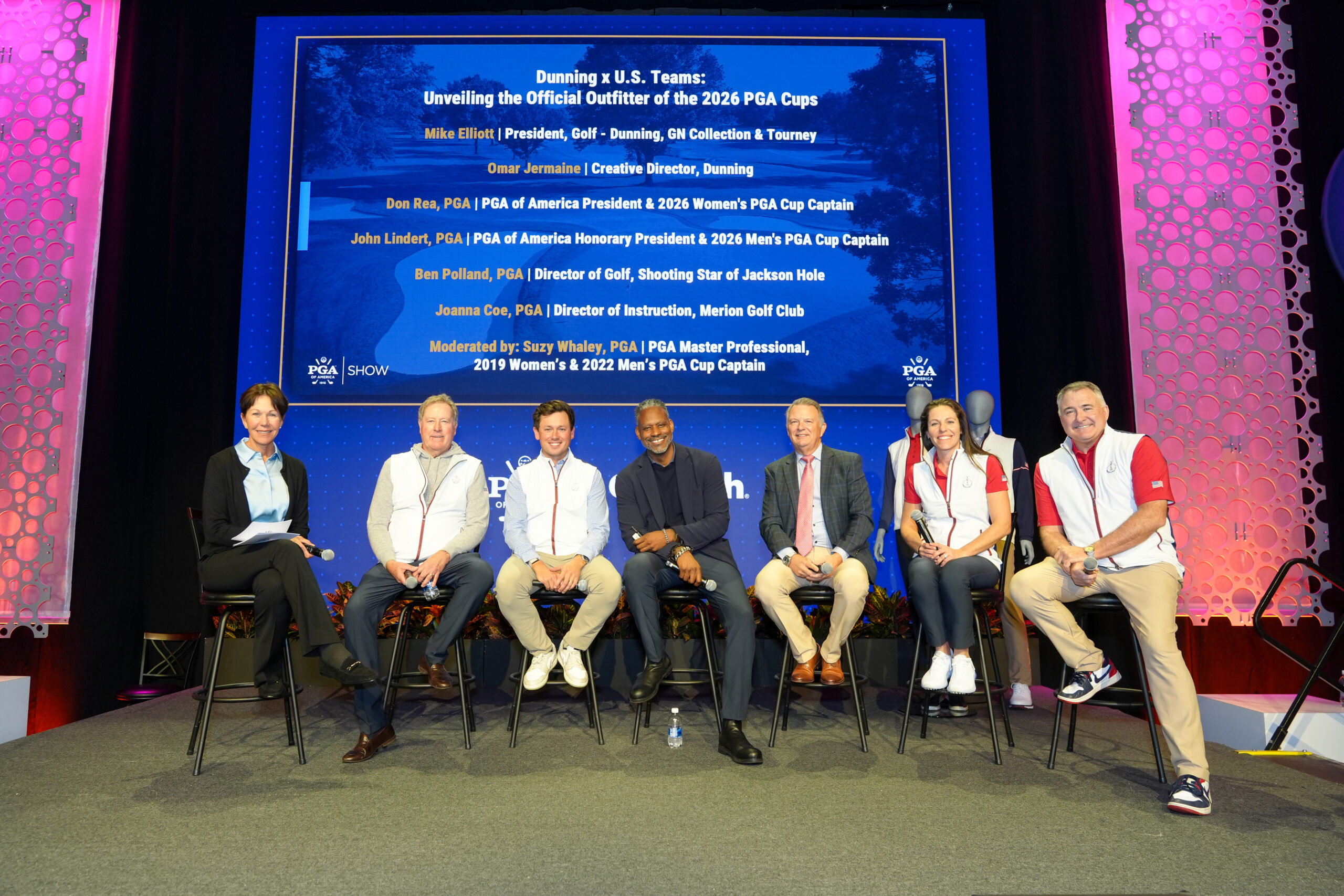 ORLANDO, FL – JANUARY 21: Moderator and PGA Master Professional Suzy Whaley, PGA of America Honorary President & Men’s PGA Cup Captain John Lindert, PGA, Director of Golf at Shooting Star of Jackson Hole Ben Polland, PGA, Creative Director at Dunning Omar Jermaine, President, Golf – Dunning, GN Collection & Tourney Mike Elliott, Director of Instruction at Merion Golf Club Joanna Coe, PGA, and PGA of America President Don Rea pose on the industry stage for the “Dunning x U.S. Teams: Unveiling the Official Outfitter of the 2026 PGA Cups” presentation during the PGA Show at Orange County Convention Center on Wednesday, January 21, 2026 in Orlando, Florida. (Photo by Darren Carroll/PGA of America)