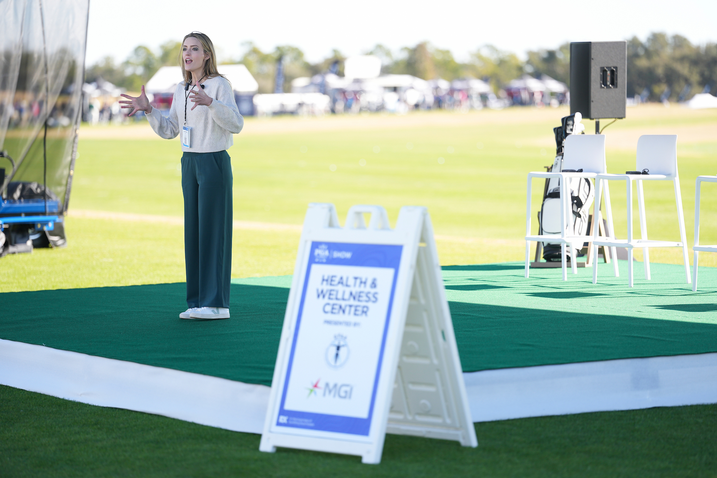 WINTER GARDEN, FL – JANUARY 20: Founder of Golf’s Online Yoga Studio Lauren McLillin speaks to attendees during the PGA Show Demo Day at Orange County National Golf Center on Tuesday, January 20, 2026 in Winter Garden, Florida. (Photo by Darren Carroll/PGA of America)