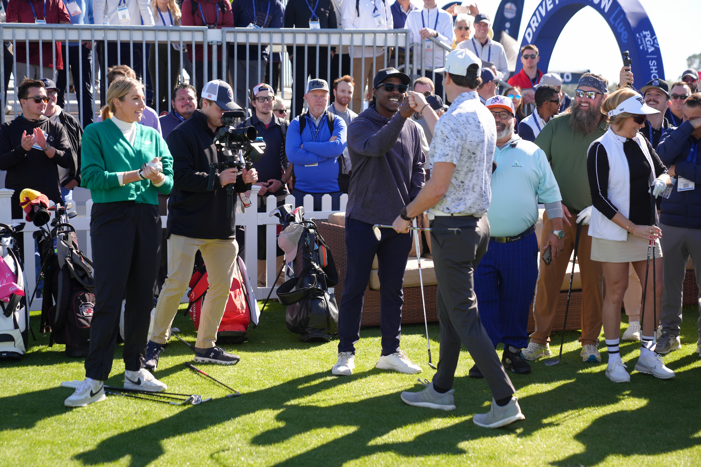 WINTER GARDEN, FL – JANUARY 20: Former NFL Player Knowshon Moreno and TV personality Blake Horstmann fist bump during the PGA Show Demo Day Skills Challenge at Orange County National Golf Center on Tuesday, January 20, 2026 in Winter Garden, Florida. (Photo by Darren Carroll/PGA of America)