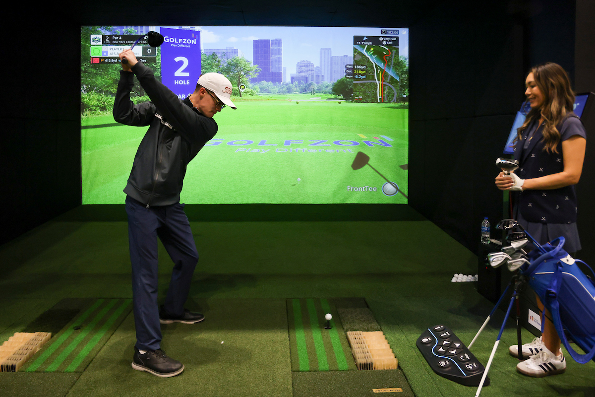 ORLANDO, FL – JANUARY 22: An attendee hits his shot at the Golfzon Citygolf simulator activation as Golf Instructor Maiya Tanaka Puterbaugh, PGA, watches on during the PGA Show at Orange County Convention Center on Thursday, January 22, 2026 in Orlando, Florida. (Photo by Scott Halleran/PGA of America)