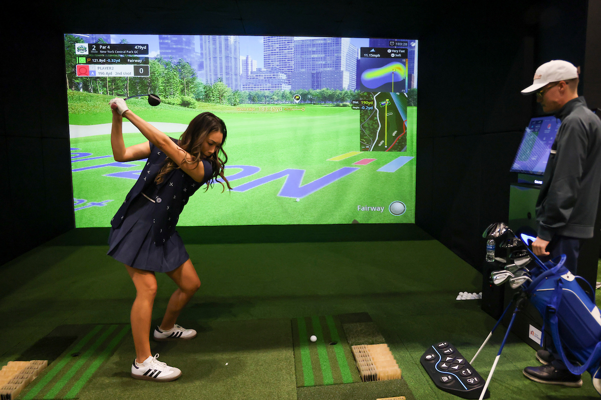 ORLANDO, FL – JANUARY 22: Golf Instructor Maiya Tanaka Puterbaugh, PGA, hits her shot at the Golfzon Citygolf simulator activation during the PGA Show at Orange County Convention Center on Thursday, January 22, 2026 in Orlando, Florida. (Photo by Scott Halleran/PGA of America)