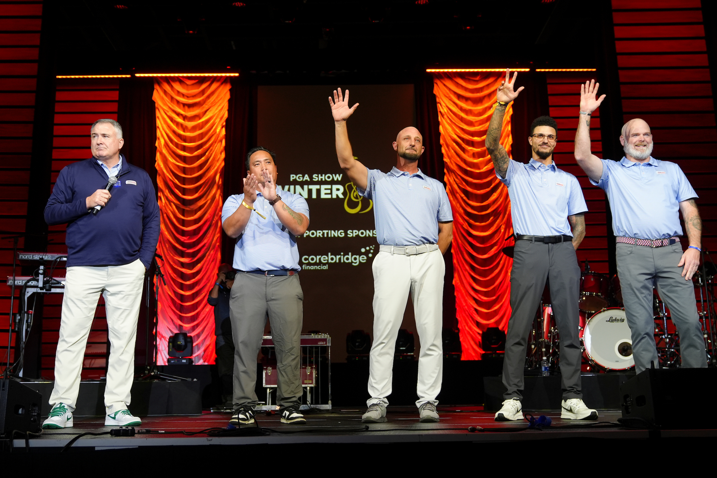 ORLANDO, FL – JANUARY 22: PGA of America President Don Rea with PGA HOPE Ambassador of Southern California DJ Naigan, PGA HOPE Ambassador of North Florida Don Moore, PGA HOPE Ambassador of Wisconsin Anthony Laske, and PGA HOPE Ambassador of the Gulf States Adam Napier on stage during the PGA Show Winter Jam at Orange County Convention Center on Thursday, January 22, 2026 in Orlando, Florida. (Photo by Darren Carroll/PGA of America)